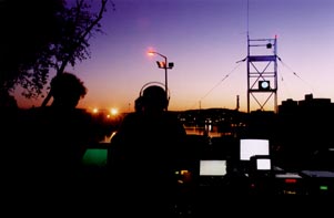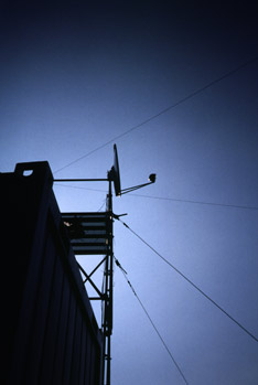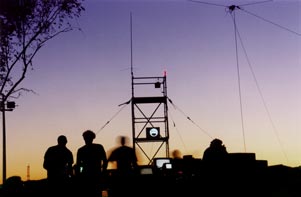 The event is a collaborative project set up by Marko Peljhan/Projekt Atol, Nullo, Random Logic, dr. Ivol and guests. The first performance of this series, SOLAR, was presented with great critical acclaim during Ars Electronica 98 in Linz. It is a logisitcally quite complex work requiring a three day minimum setup period. SIGNAL-SEVER! is the second of the performances in the series, which has been in preparation for more than a year. It features live electronic music and signals interception and specific signals processing and image distribution systems. The work is based on four large antenna arrays and a 7X7m stage, with 3 video projectors and a 4000 W sound system. The signals unit used in the work was developed as part of the MAKROLAB project (http://makrolab.ljudmila.org and the WORLD-INFORMATION.ORG project (http://www.world-information.org) of which PROJEKT ATOL is one of the main production partners. The basic premise of the work is the follow-up of the signal electromagnetic territory from dusk til dawn. The work is also based on some of Nikola Tesla's experiments. interview with Marko Peljhan