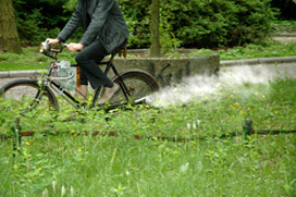 As an alternative to petrol, this custom-made bicycle transforms kinetic energy produced by the cyclist into smoke. The will to power is a renewable energy resource that can be recuperated by a power generator supplying enough electricity to operate a smoke machine. The work is the result of two coupled machines; the one human is productive and the other machine, consumptive. This coupling of machines produces smoke, a waste energy that is liberated freely in the atmosphere.