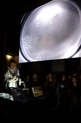 Performancē ir redzami sonificētas silikona eļļas virsmā veidoti silikona eļļas pilieni, kas, it kā pilot, sastingst plānā, zem katra piliena akustiski veidotā gaisa membrānā. Nošķirot šos pulsējošos sferoīdus no pārējā šķīduma, tiek panāktas to vibrācijas uz gaismas – eļļas virsmas. Atkārtoti kustīgais piliens izraisa stāvošā kapilārā viļņa rašanos, kas savienojas ar blakus esošo pilienu viļņiem. Šis tuvais, pievelkošais spēks pārtop pilienu pāru orbitālā kustībā, veidojot šo pilienu ķekarus. Stabilāku impulsu brīžos rodas pašorganizējoši ģeometriski kopumi, kuri ir saistīti ar tuvāko sfēru sablīvēšanos: paaugstinot frekvenci, samazinās attālums starp pilieniem, kas, savukārt, izraisa biezu režģveida struktūru veidošanos.