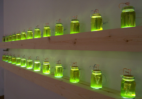 The third telegraphic receiver is a line of 26 antique glass jars, each filled with an electrolyte and holding a pair of metal electrodes, one of them shaped like a letter of the alphabet. The electrical currents cause the electrodes to change from shiny metallic to black alternately and to produce hydrogen bubbles.