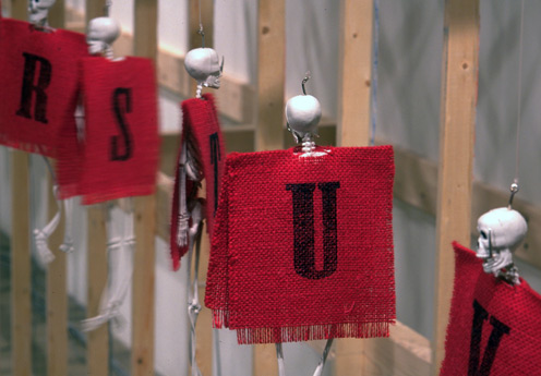 Email messages sent from around the world to DeMarinis e-mail are received by a computer and spelled out, one letter at a time over three telegraph receivers: a circular array of 26 talking chamber pots speaks out the letters in 26 different voices. Another receiver is made up of a chorus line of 26 little dancing skeletons. Each wears a tiny poncho emblazoned with a letter of the alphabet. When each letter of a message is activated, the skeleton jumps, producing a dense macabre as the email messages roll off the Internet.