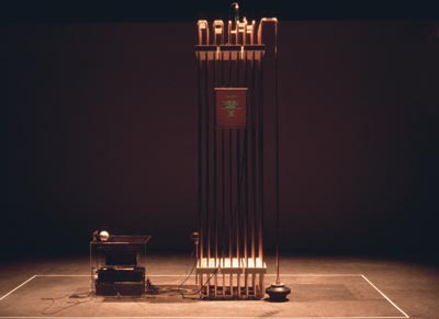 In this piece, the body consists of acoustic waves which are channelled through a system of tubes. A circular causal process is required in order to transform this short-lived body into a long-lasting one. This feedback has explosive and implosive properties; therefore, a self-regulating system is implemented, preserving the physical equilibrium through observable and dynamic behaviour. Only then can the body be used as storage memory.